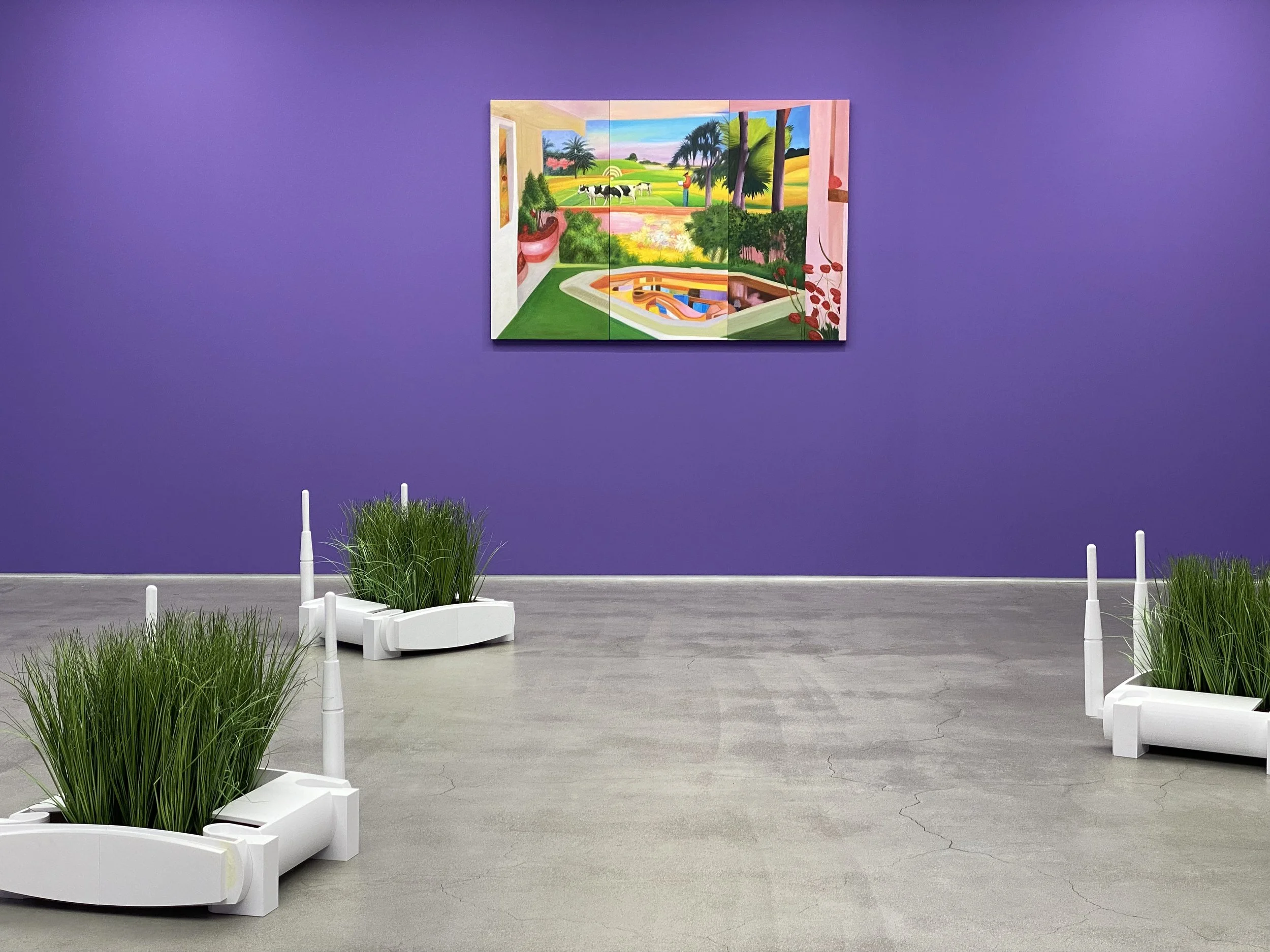 exhibition view of Copy of Copy of Copy of Copy, 2024, Installation, Acrylic on canvas, fireproof wooden boards, stainless steel, iron, plants, table, chairs, and other materials, 7.5 x 6 x 4 m, Image courtesy of the artist and art basel hong kong.